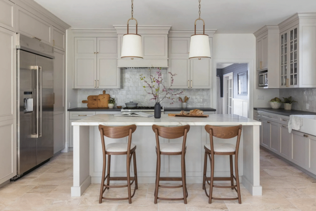 At Grey Stone Remodeling, we’ve seen a major shift toward walnut cabinets, matte brass finishes, and quartzite islands with character. These materials don’t just look stunning, they age gracefully and bring warmth to every family gathering.