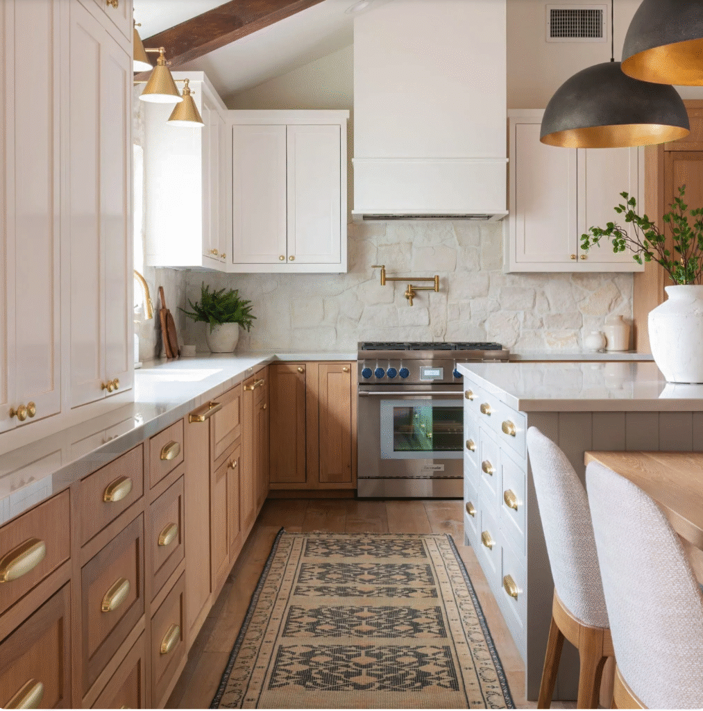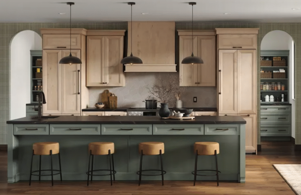 The all-white kitchen era is over. Homeowners are embracing natural woods, textured stones, and soft, earthy palettes, think sage green, clay, warm beige, and oak grain.